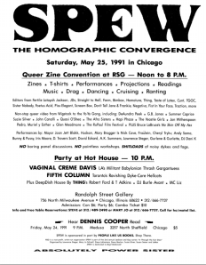 DT: So, what happened at SPEW in ’91? I’m wondering what was unique about it, how did it kind of change the shape of the queer community in Chicago, who knew each other, who was talking to who?