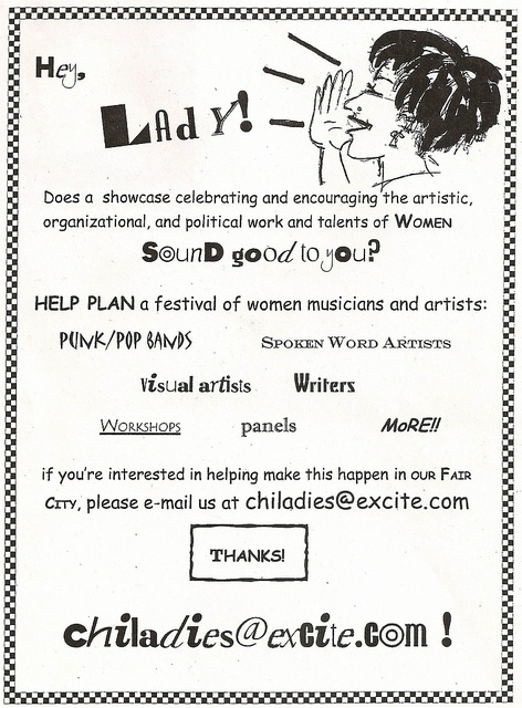Marf Wright: I went to the original Ladyfest in Olympia in 2000 and got really fired up from that experience, and I also didn’t really feel a part of anything here in Chicago, I’d been living here for about five years and just felt disconnected, and not feeling like I had any community. And, I go across the country to this festival and lo and behold, I feel part of something, this very powerful, and, it was just an awesome three days, incredible. And the organizers there were very clear that this was a one-time thing, and they said, “go do it in your own town. We’re not doing this again, this is it.” And I thought, well, maybe we should try doing this in Chicago, cause we don’t really have anything like this. So, I came back and had this crazy idea and got a flier together, and started going to shows and talking to people, that’s how I met Lauren Cumbia. She’s very friendly, [laughter], and she was the first person who was really enthusiastic and said, “yeah, we can do this, we can do this.” And I said “well, it might take a while to get it going, and I don’t know if we’ll be able to do it next year, but maybe it’ll take two years” and she said, “nah, nah, we can do it, we can do it!” It just kind of took off from there, getting the word out, meeting other people, yeah.