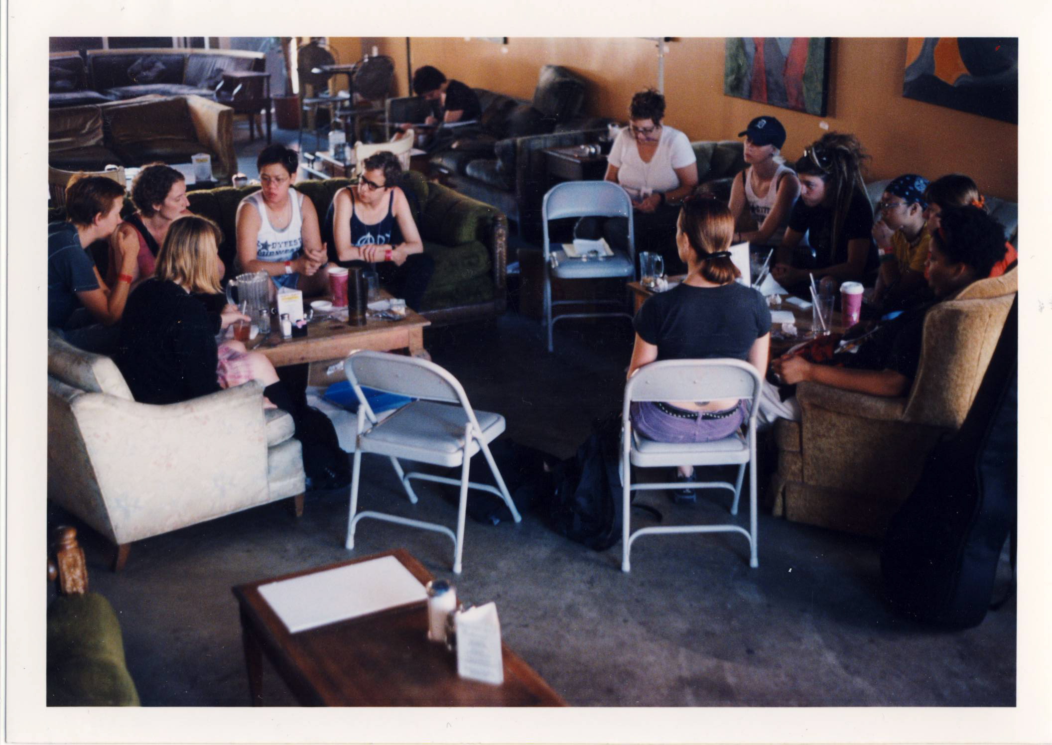 Katherine Mingle: I was just thinking about the same thing too, earlier, about how I actually knew of Summer, because I worked at Schuba’s, which was one of the venues that was used in Ladyfest, but Summer used to play at Schuba’s. I heard her name and met her, and was like, “oh, yeah…” But I didn’t know anybody in this room prior to that. I had moved to Chicago in ’99, and I worked at various restaurants and bars and I think unfortunately for me I was not really feeling connected to Chicago, I was part of the bar communities, and I worked at a music venue but it was really a lot of surface relationships, things like that, I didn’t really feel a deep connection to Chicago, at that point.